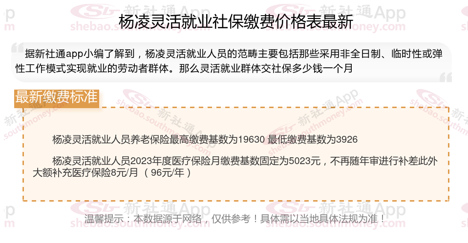 随着经济的发展和社会的进步,灵活就业人员越来越多,但是很多人不知道如何缴纳社保。本文将介绍2024年杨凌灵活就业人员社保缴费基数及如何缴纳社保,能领取多少钱,帮助大家更好地了解灵活就业社保,随着新社通APP小编一起了解杨凌灵活就业社保缴费最新资讯吧。