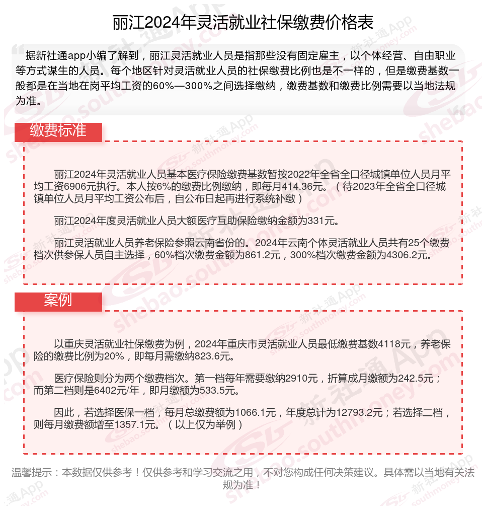 随着经济的发展和社会的进步,灵活就业人员越来越多,但是很多人不知道如何缴纳社保。本文将介绍2024年丽江灵活就业人员社保缴费基数及如何缴纳社保,能领取多少钱,帮助大家更好地了解灵活就业社保,随着新社通APP小编一起了解丽江灵活就业社保缴费最新资讯吧。