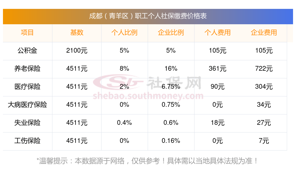 一、成都(青羊区)职工社保缴费多少钱?成都(青羊区)职工社保缴费基数最新参考为:3579.00,具体如下: