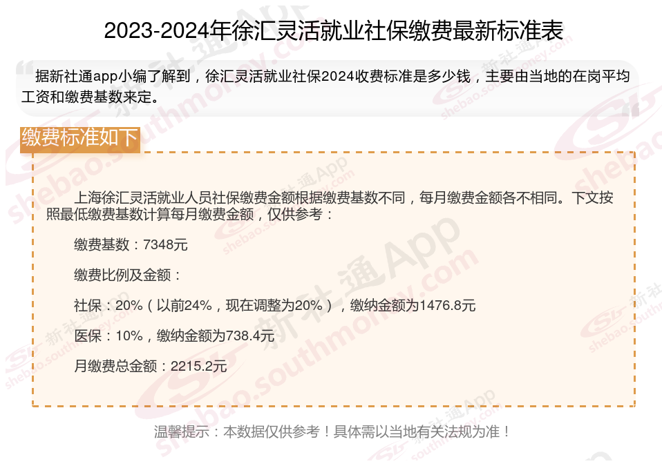 徐汇灵活就业社保2024收费标准是多少钱,主要由当地的在岗平均工资和缴费基数来定。其次,灵活就业社保缴纳跟职工缴纳不同的地方在于,灵活就业社保参保只能参保养老保险和医疗保险,且缴纳比例完全由个人承担。另外,灵活就业人员社保参保选择,可自由选择参保城镇职工社保和城乡居民保险。2024年徐汇灵活就业社保缴多少钱?如何缴纳?怎么计算待遇?新社通APP小编将在下文为您详细说明。