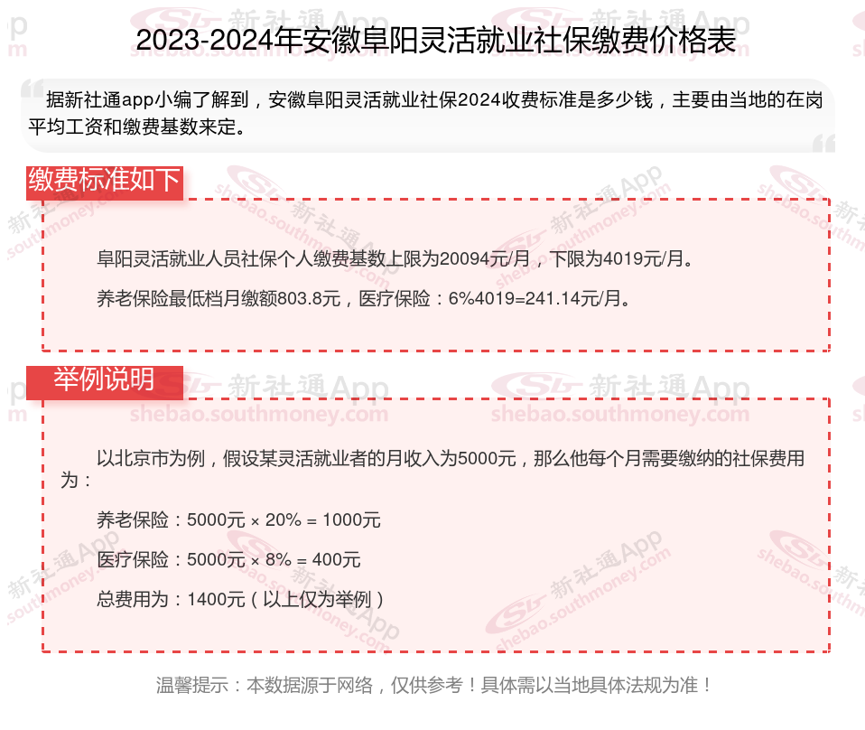 一、2024年安徽阜阳灵活就业社保缴费标准表 安徽阜阳灵活就业社保多少钱一个月?