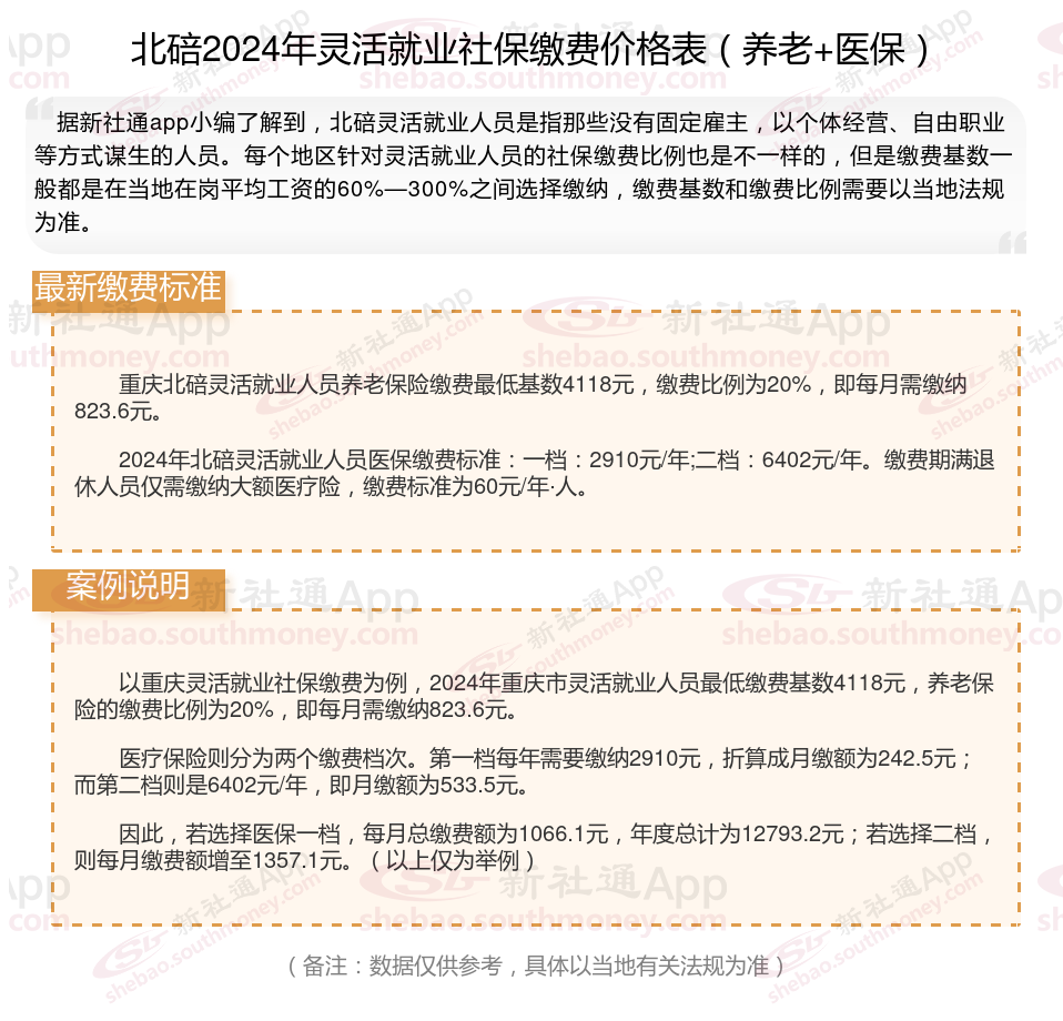 一、2024年北碚灵活就业社保缴费标准表 北碚灵活就业社保多少钱一个月?