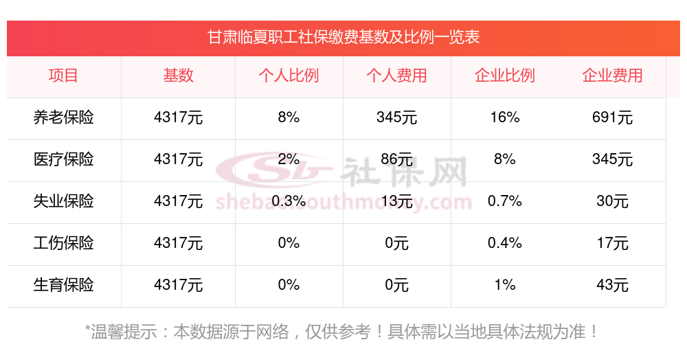 据新社通app小编了解到,2023-2024年甘肃临夏社保缴费基数参照为3579.00,甘肃临夏社保缴费明细如下: