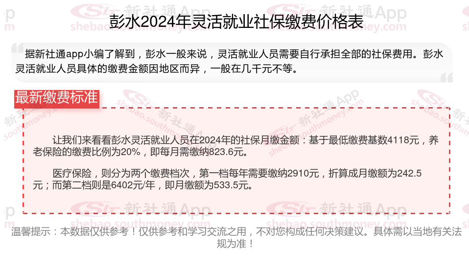 一、2024年彭水灵活就业社保缴费标准表 彭水灵活就业社保多少钱一个月?