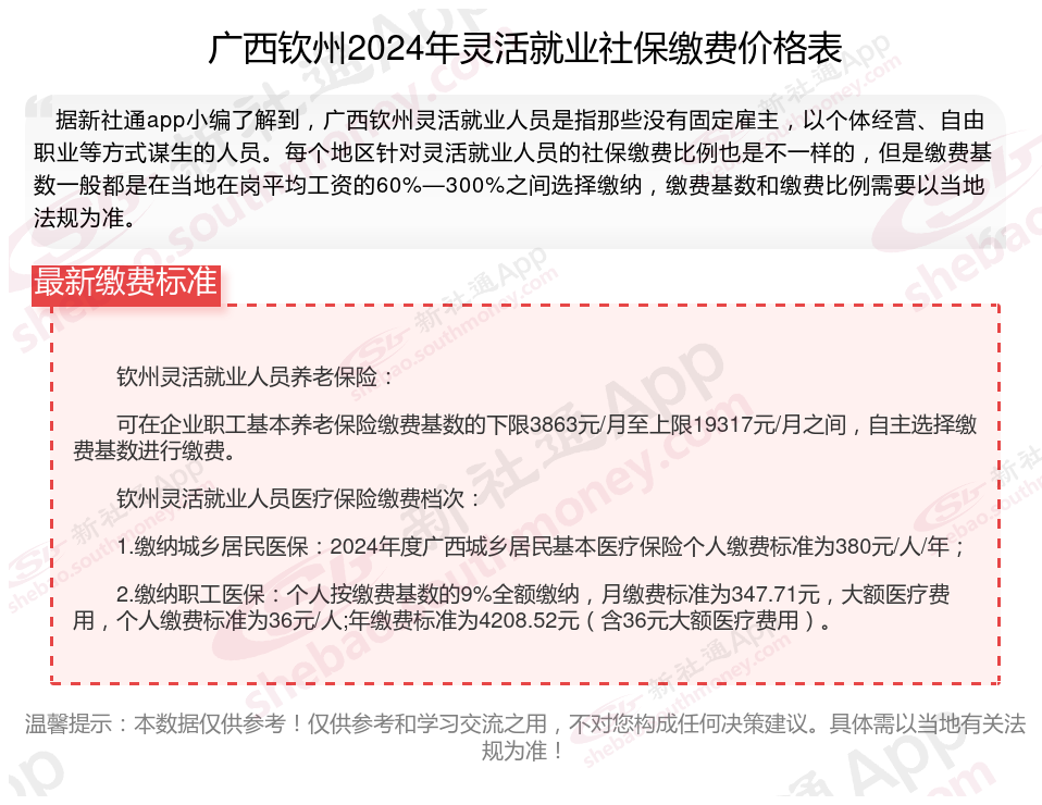 二、广西钦州2024年灵活就业社保缴费基数、比例最新消息