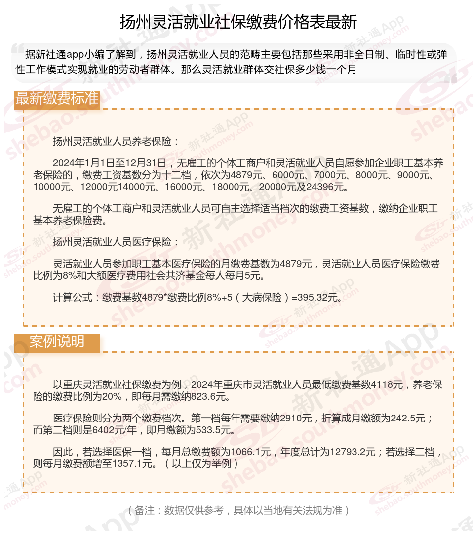 一、2024年扬州灵活就业社保缴费标准表 扬州灵活就业社保多少钱一个月?