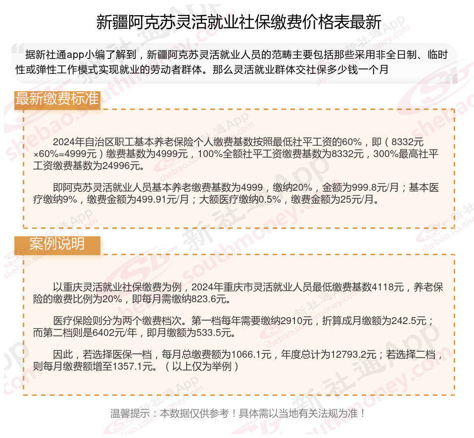 一、2024年新疆阿克苏灵活就业社保缴费标准表 新疆阿克苏灵活就业社保多少钱一个月?