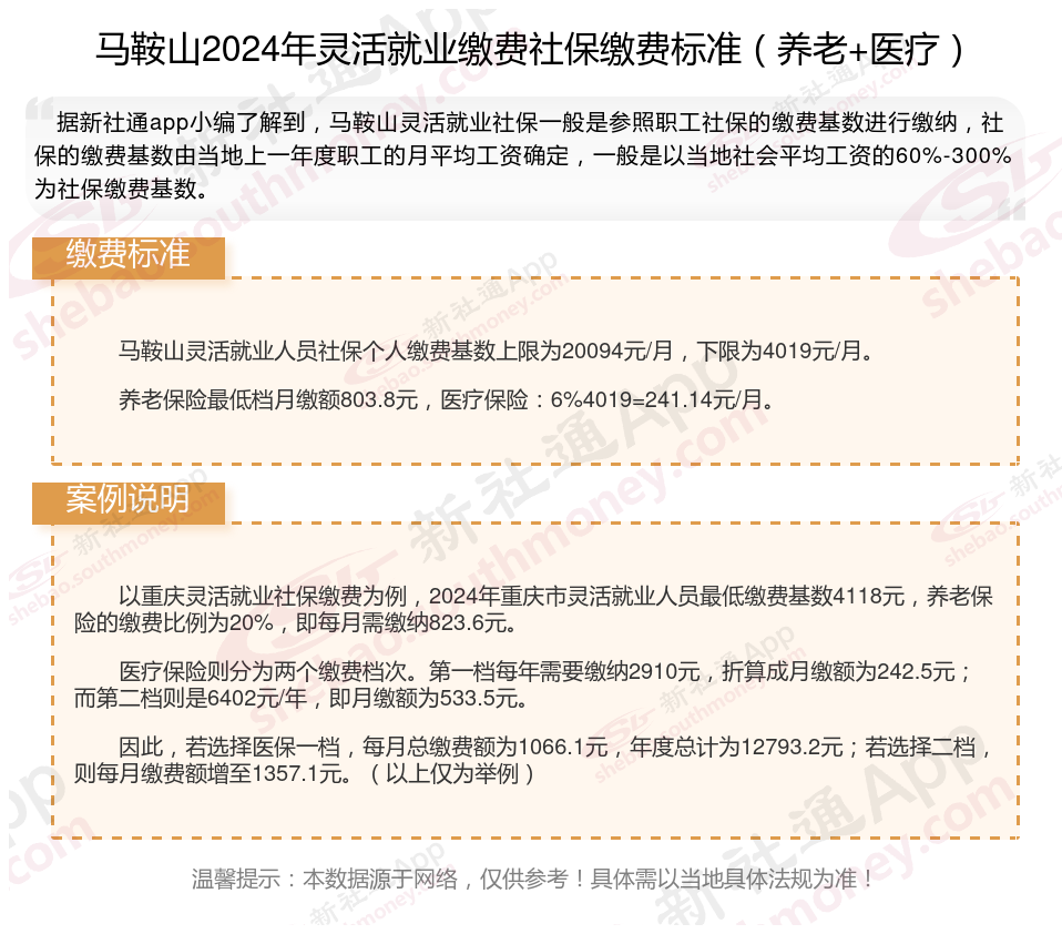 随着经济的发展和社会的进步,灵活就业人员越来越多,但是很多人不知道如何缴纳社保。本文将介绍2024年马鞍山灵活就业人员社保缴费基数及如何缴纳社保,能领取多少钱,帮助大家更好地了解灵活就业社保,随着新社通APP小编一起了解马鞍山灵活就业社保缴费最新资讯吧。