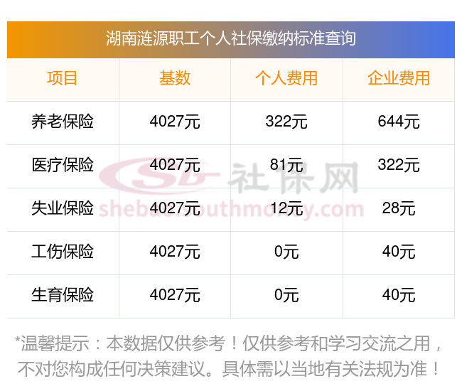 据新社通app显示,湖南涟源企业职工社保缴费基数为:3579.00元,湖南涟源职工社保费用详情如下: