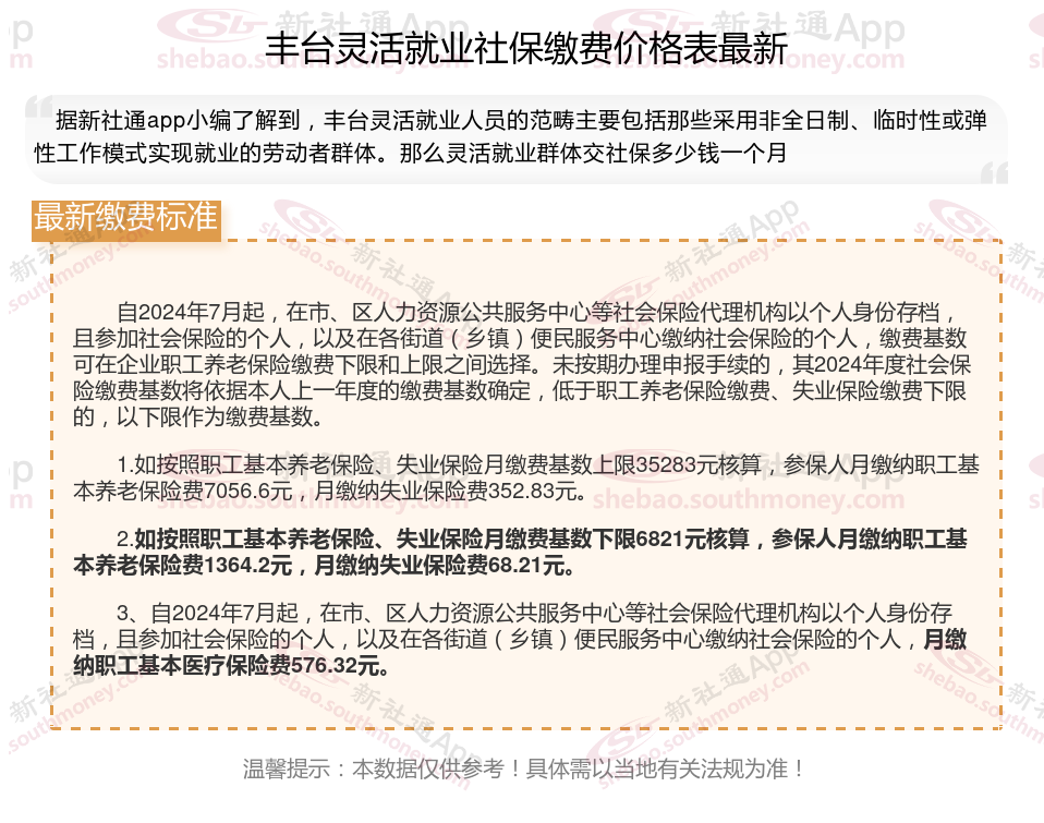 什么是灵活就业社保?简单讲灵活就业人员购买的社保就叫灵活就业社保。灵活就业人员是指以非全日制、临时性和弹性工作等灵活形式就业的人员。那么2024年丰台灵活就业社保缴费基数是多少?要怎么缴费?15年后能拿到多少钱?接下来随新社通APP小编一起了解丰台灵活就业社保缴费具体详情吧。