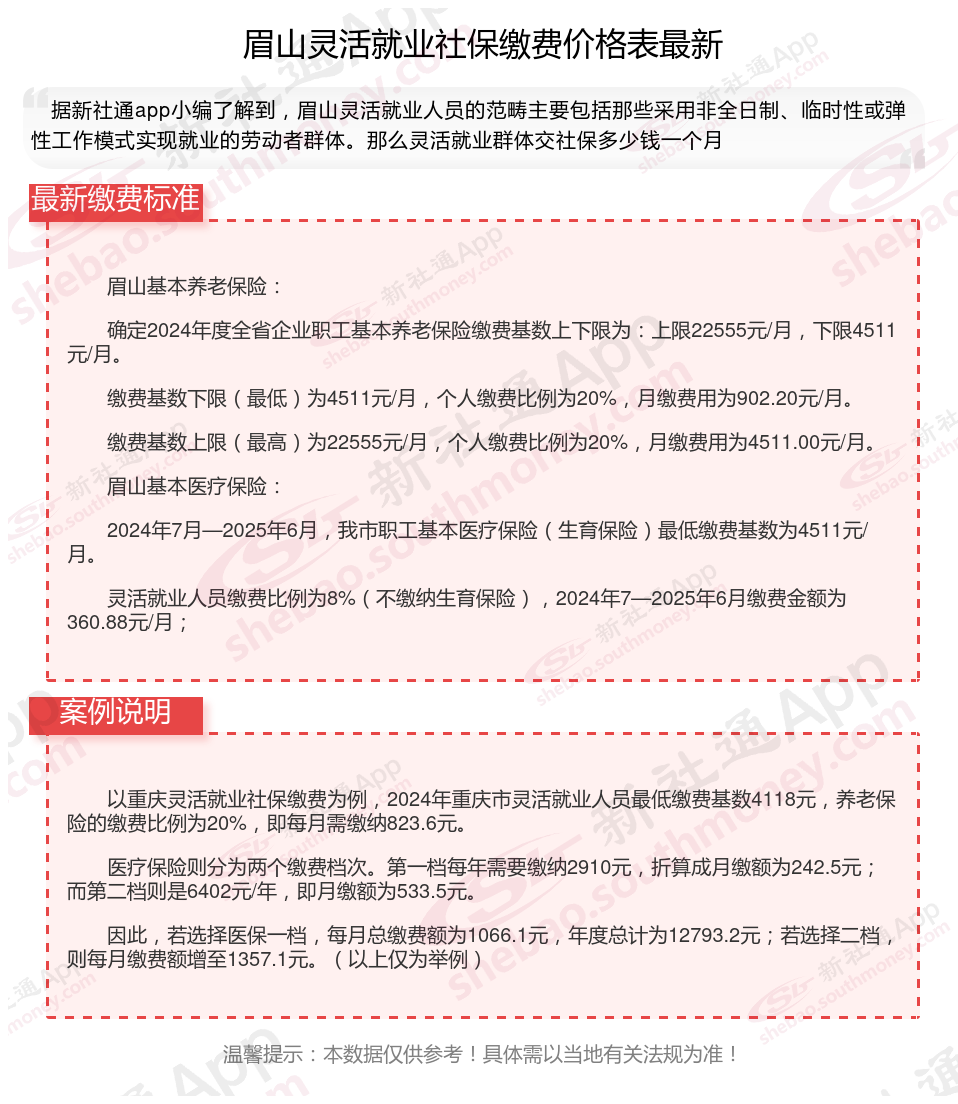 一、2024年眉山灵活就业社保缴费标准表 眉山灵活就业社保多少钱一个月?