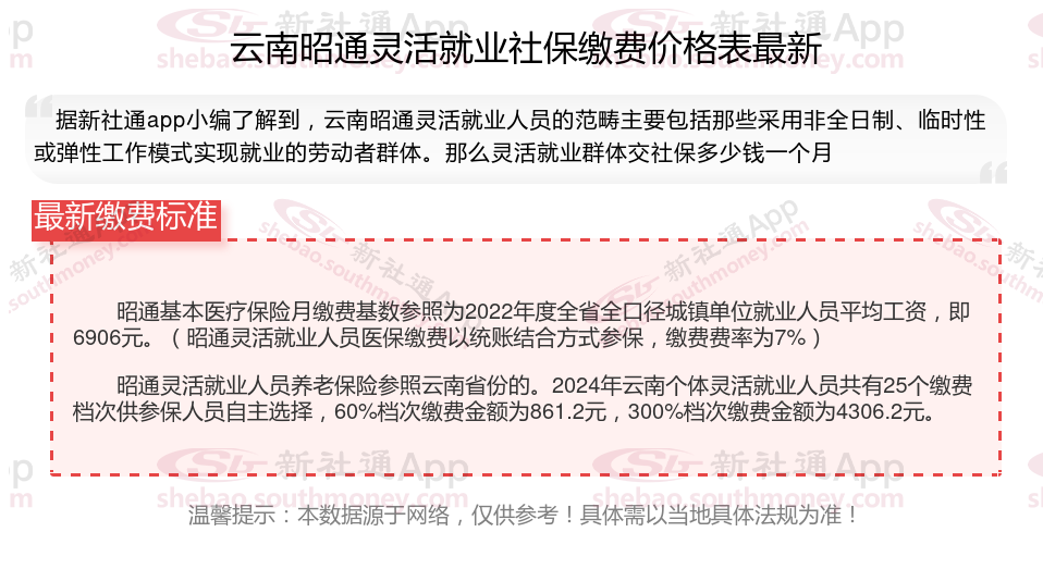 一、云南昭通灵活就业社保缴费标准表2024年 云南昭通灵活就业社保多少钱一个月?