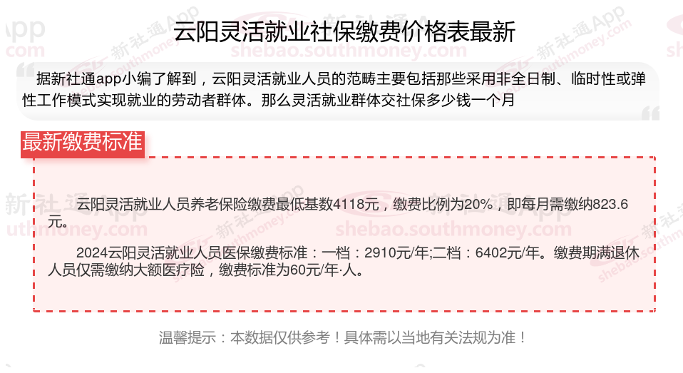 二、2024年云阳灵活就业社保缴费标准,最新如下: