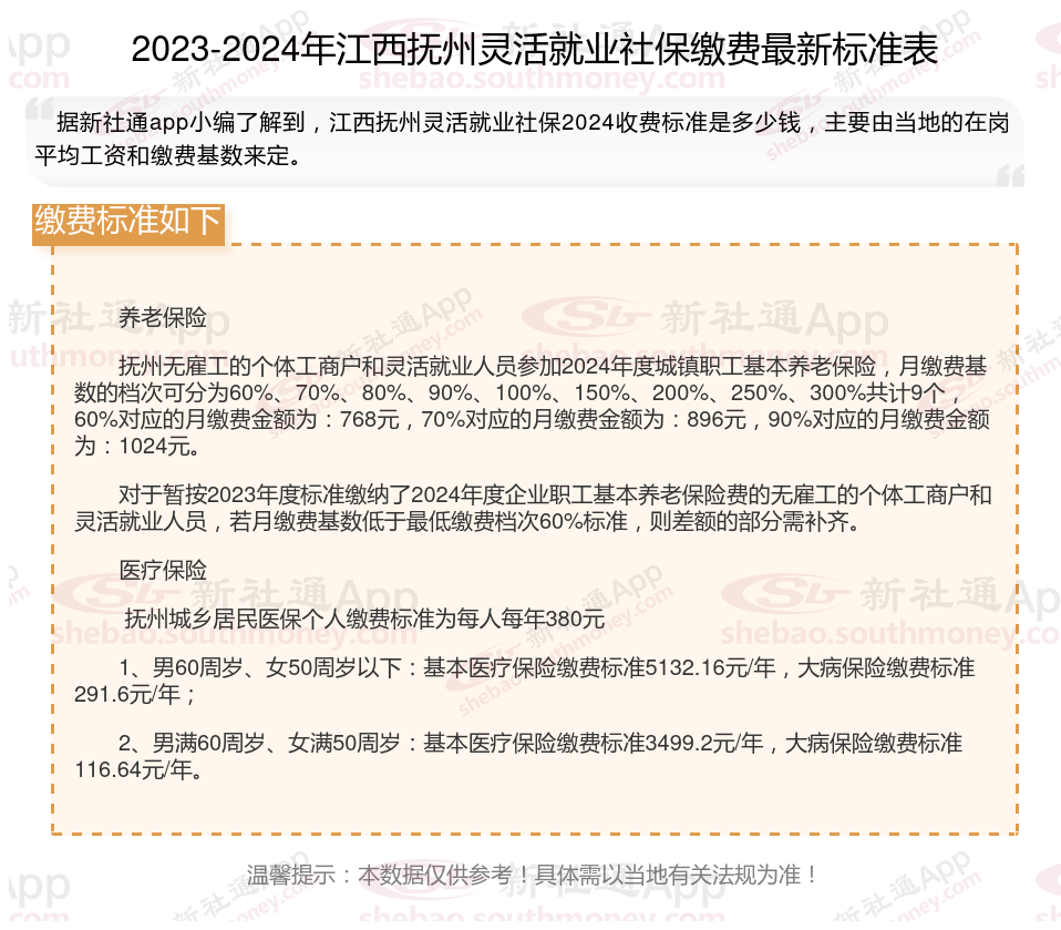 二、2024年江西抚州灵活就业社保缴费标准是多少钱,最新如下:
