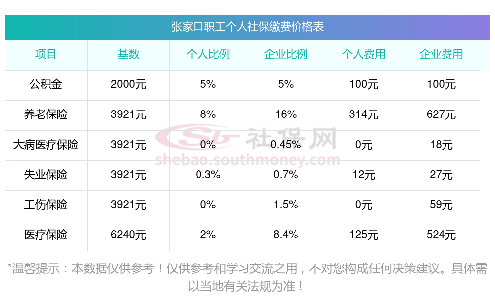 2024年张家口社保缴费多少钱?下表是2023-2024年张家口社保费用明细参考,新社通app-社保缴费查询工具提供的最新数据如下: