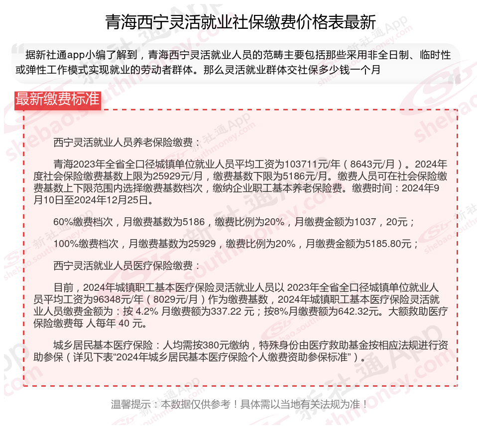 随着经济的发展和社会的进步,灵活就业人员越来越多,但是很多人不知道如何缴纳社保。本文将介绍2024年青海西宁灵活就业人员社保缴费基数及如何缴纳社保,能领取多少钱,帮助大家更好地了解灵活就业社保,随着新社通APP小编一起了解青海西宁灵活就业社保缴费最新资讯吧。