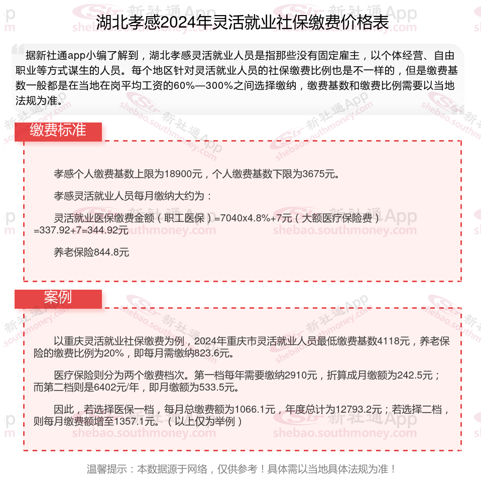 一、2024年湖北孝感灵活就业社保缴费标准表 湖北孝感灵活就业社保多少钱一个月?