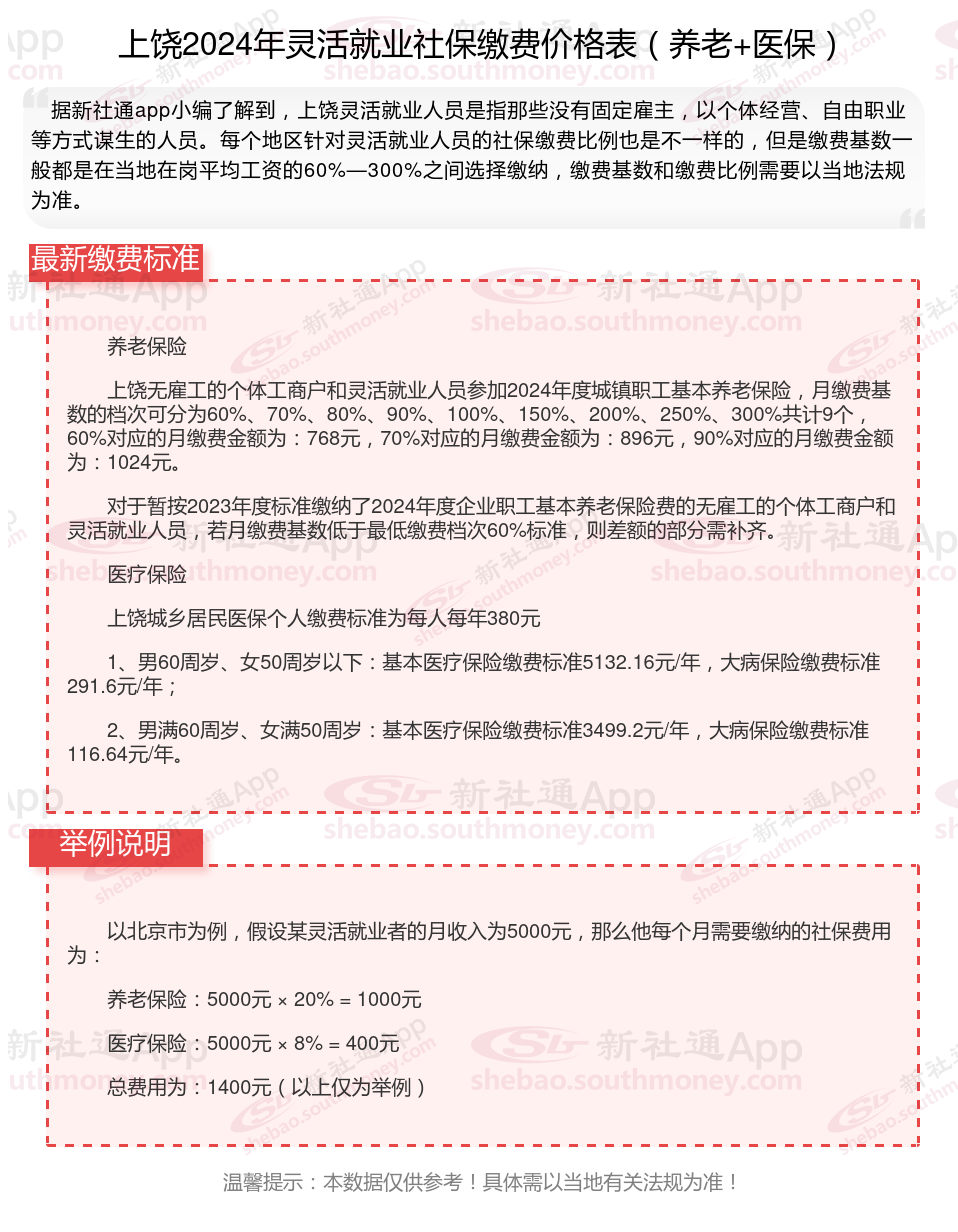 二、上饶2024年灵活就业社保缴费基数、比例最新消息