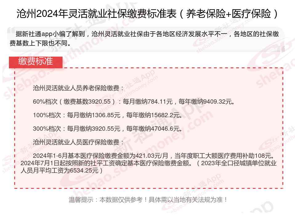 一、2024年沧州灵活就业社保缴费标准表 沧州灵活就业社保多少钱一个月?