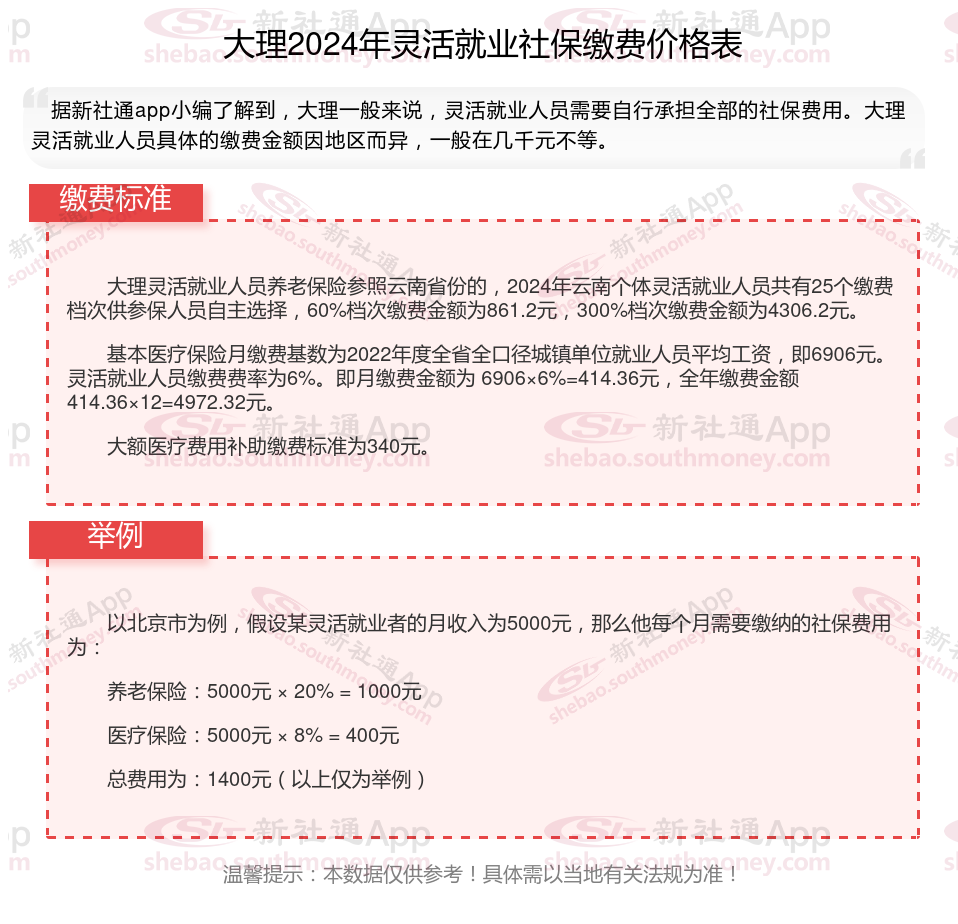 一、2024年大理灵活就业社保缴费标准表 大理灵活就业社保多少钱一个月?