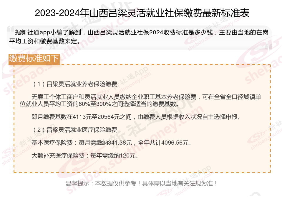 什么是灵活就业社保?简单讲灵活就业人员购买的社保就叫灵活就业社保。灵活就业人员是指以非全日制、临时性和弹性工作等灵活形式就业的人员。那么2024年山西吕梁灵活就业社保缴费基数是多少?要怎么缴费?15年后能拿到多少钱?接下来随新社通APP小编一起了解山西吕梁灵活就业社保缴费具体详情吧。