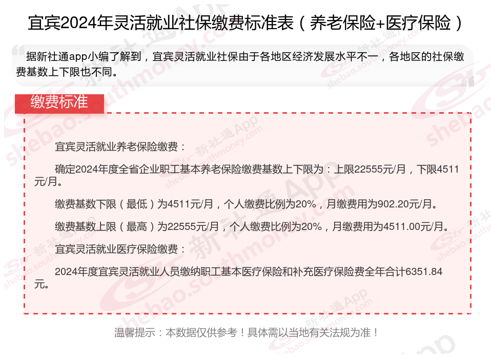一、2024年宜宾灵活就业社保缴费标准表 宜宾灵活就业社保多少钱一个月?