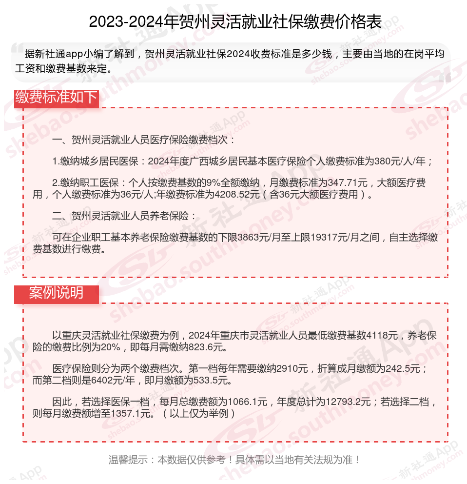 一、2024年贺州灵活就业社保缴费标准表 贺州灵活就业社保多少钱一个月?