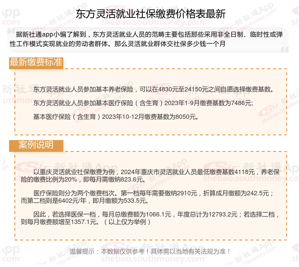 一、东方灵活就业社保缴费标准表2024年 东方灵活就业社保多少钱一个月?