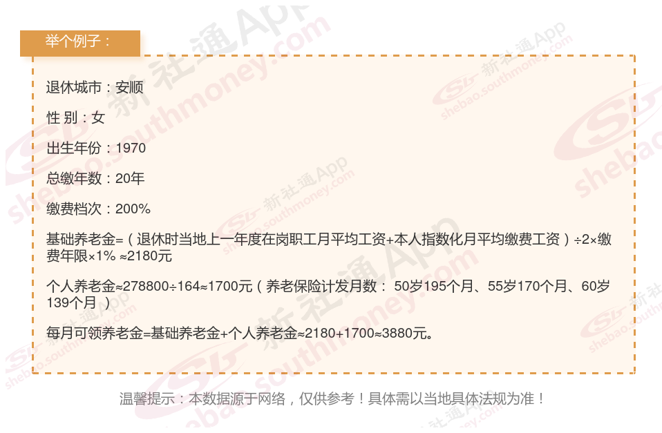 退休城市:安顺,性别:女,出生年份:1970,总缴年数20年,缴费档次:200%,新社通app养老金计算器所得: