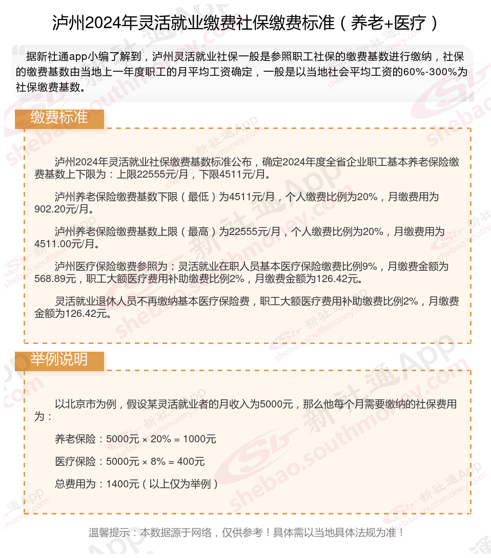 一、2024年泸州灵活就业社保缴费标准表 泸州灵活就业社保多少钱一个月?