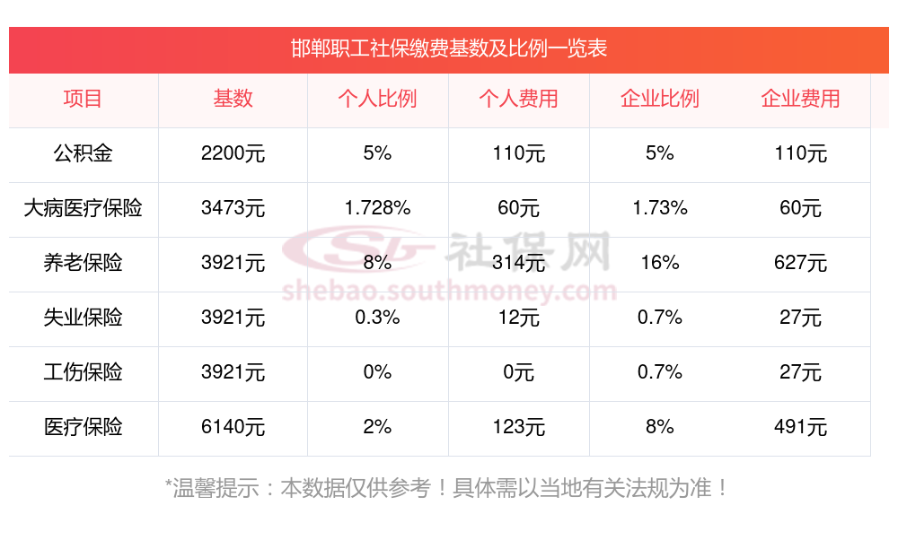 据新社通app小编了解到,2023-2024年邯郸社保缴费基数参照为3579.00,邯郸社保缴费明细如下: