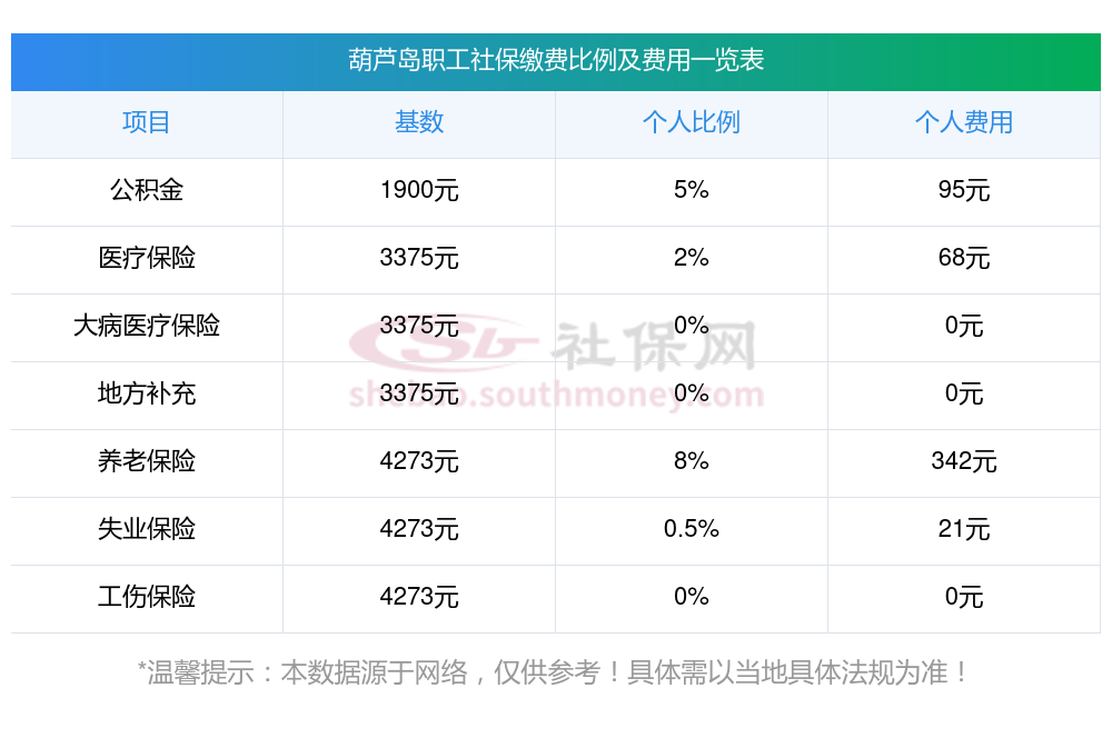 根据新社通app-社保缴费查询工具提供的最新数据,葫芦岛地区2025年的社保缴费标准已经确定。以下是各项保险的缴费比例及相应金额(基于一定的缴费基数)的详细说明: