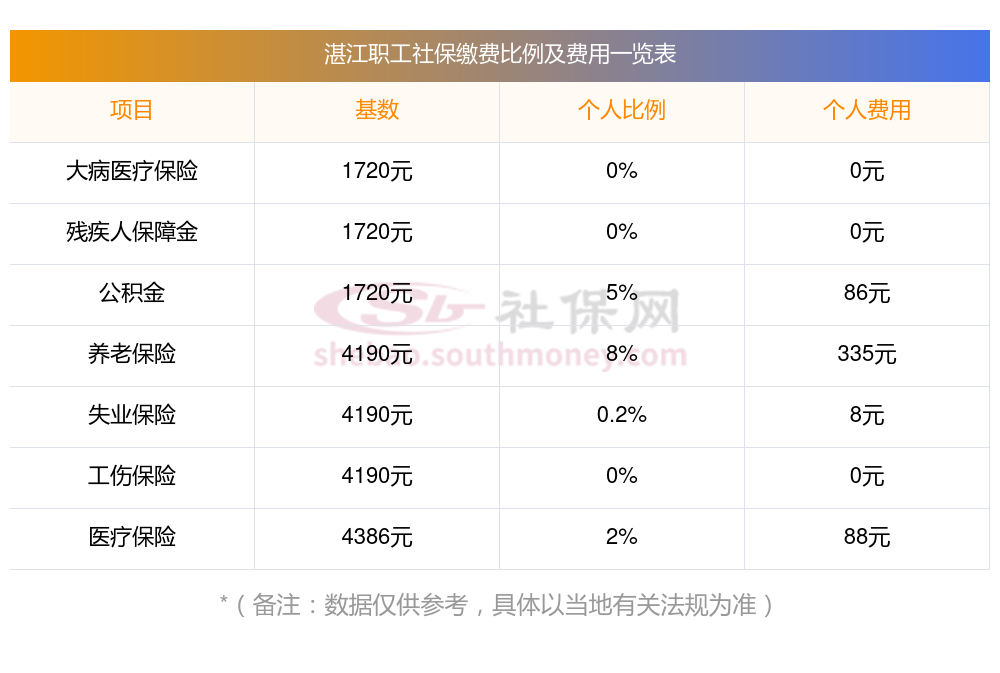 一、据新社通app显示,2023-2024年湛江社保缴费基数最新为3579.00,湛江社保缴费标准如下: