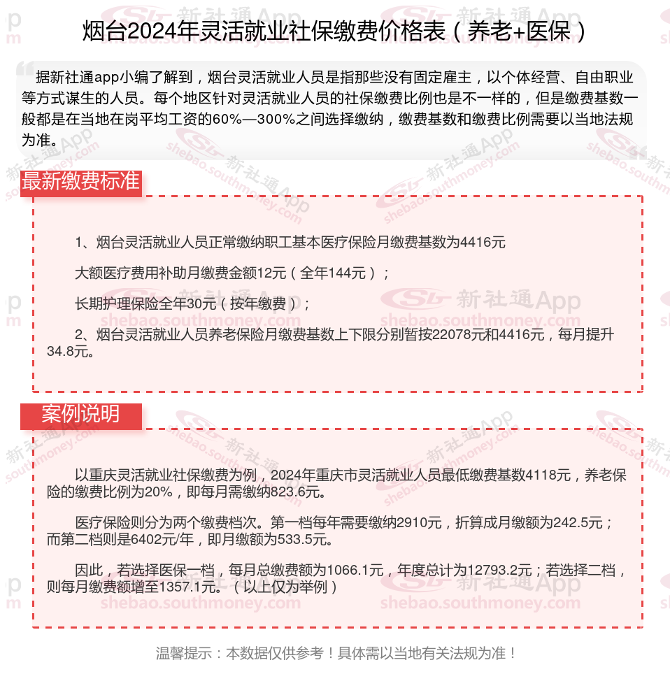 一、2024年烟台灵活就业社保缴费标准表 烟台灵活就业社保多少钱一个月?
