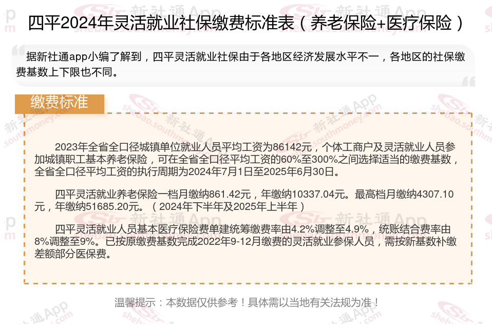 一、2024年四平灵活就业社保缴费基数、比例最新消息