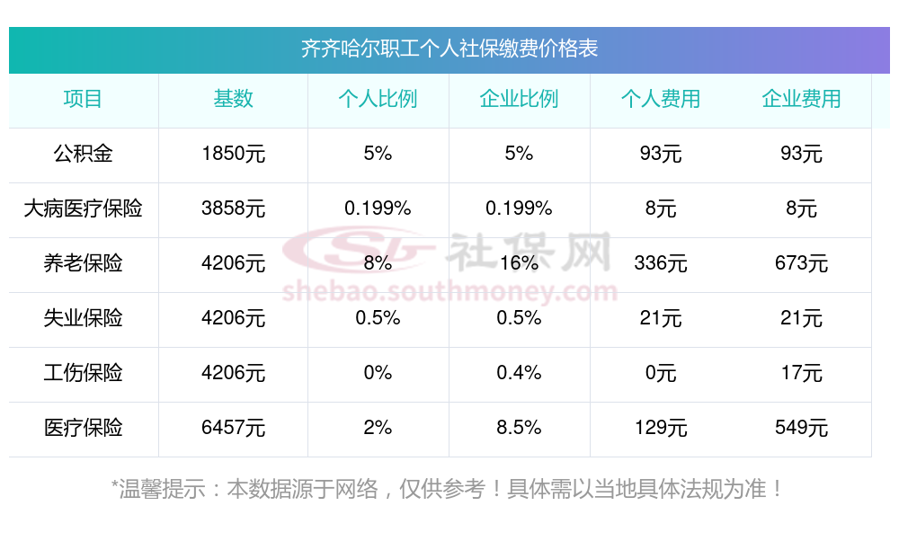 2025年齐齐哈尔社保缴费多少钱?下表是2023-2024年齐齐哈尔社保费用明细参考,新社通app-社保缴费查询工具提供的最新数据如下: