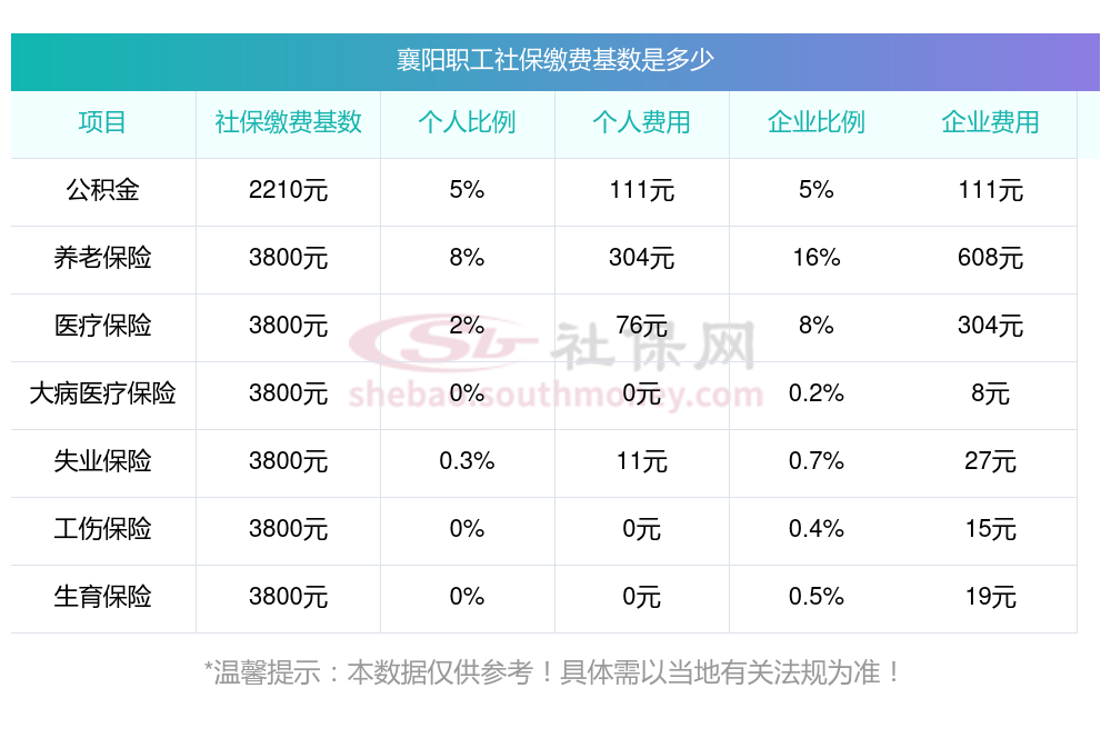 湖北襄阳缴费社保比例一览 社保公司和个人各交多少?下表是2024-2025年湖北襄阳社保费用明细参考,新社通app-社保缴费查询工具提供的最新数据如下: