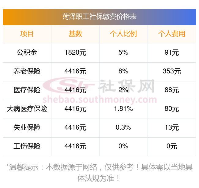 2025年菏泽社保缴费多少钱?下表是2024-2025年菏泽社保费用明细参考,新社通app-社保缴费查询工具提供的最新数据如下: