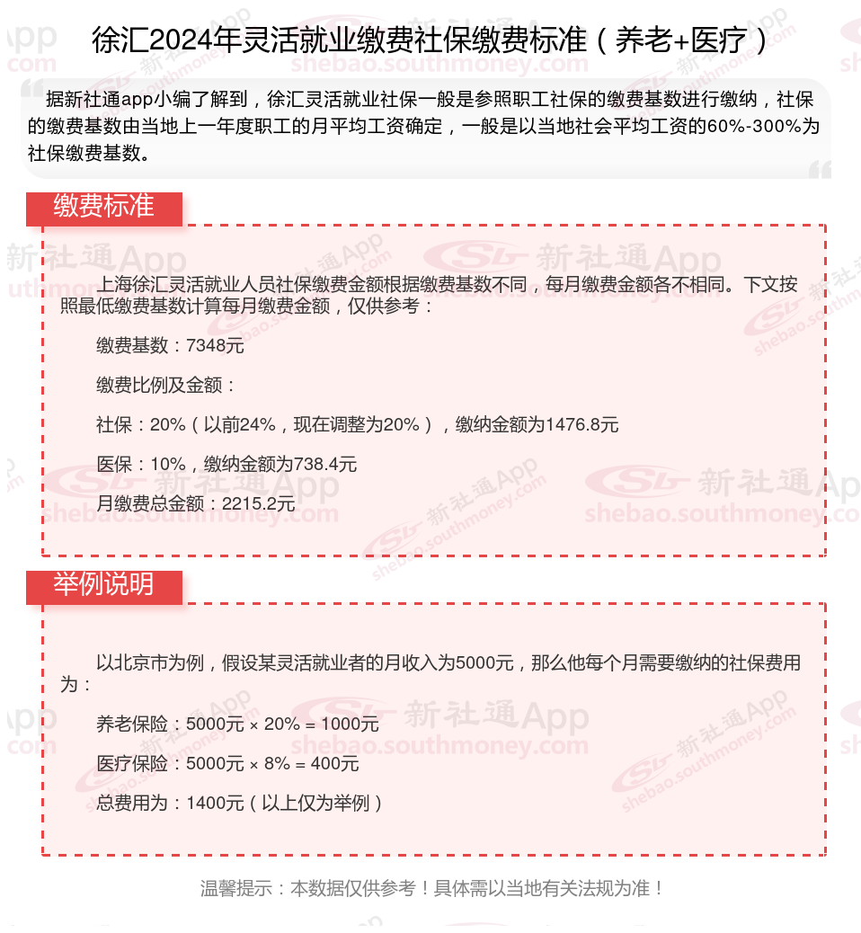 徐汇灵活就业社保2024收费标准是多少钱,主要由当地的在岗平均工资和缴费基数来定。其次,灵活就业社保缴纳跟职工缴纳不同的地方在于,灵活就业社保参保只能参保养老保险和医疗保险,且缴纳比例完全由个人承担。另外,灵活就业人员社保参保选择,可自由选择参保城镇职工社保和城乡居民保险。2024年徐汇灵活就业社保缴多少钱?如何缴纳?怎么计算待遇?新社通APP小编将在下文为您详细说明。