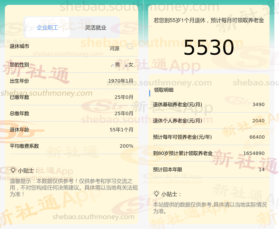 个人档案:女性,1970年出生,河源退休职工,社保缴费25载,档次200%。