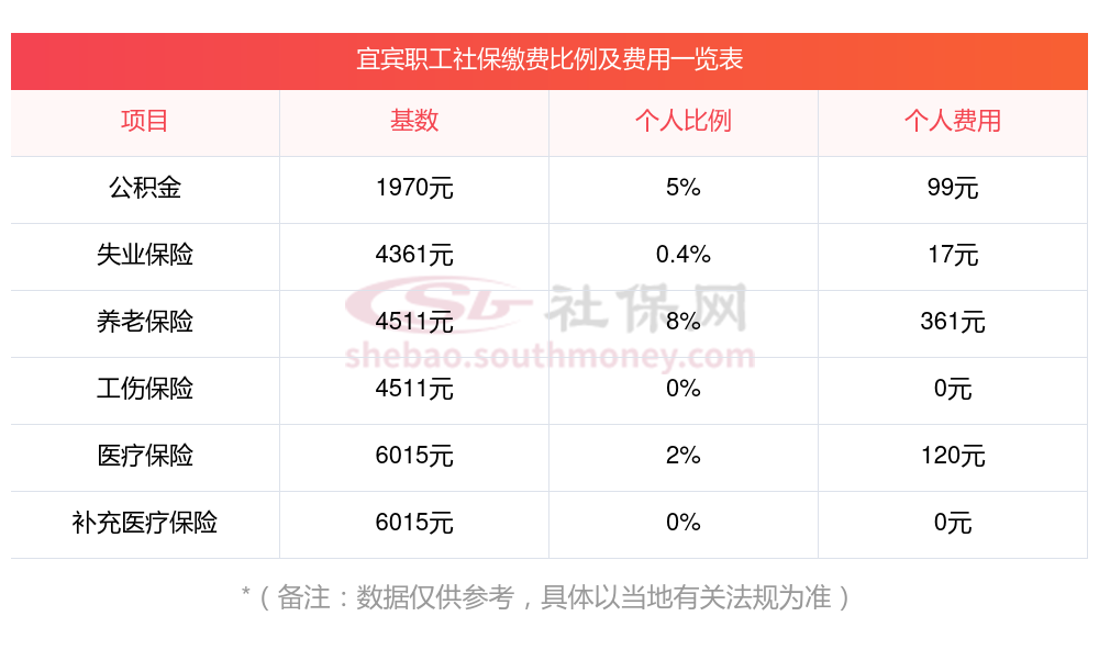 2025年宜宾社保缴费多少钱?下表是2023-2024年宜宾社保费用明细参考,新社通app-社保缴费查询工具提供的最新数据如下:
