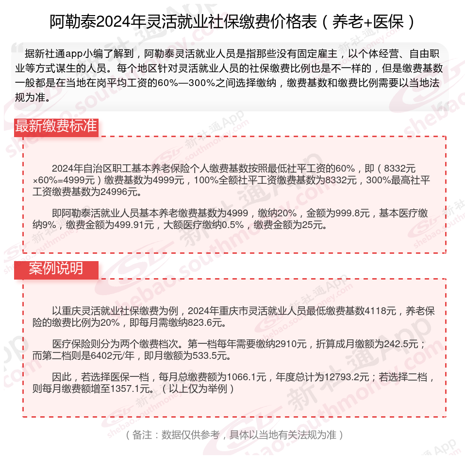 二、阿勒泰2024年灵活就业社保缴费基数、比例最新消息