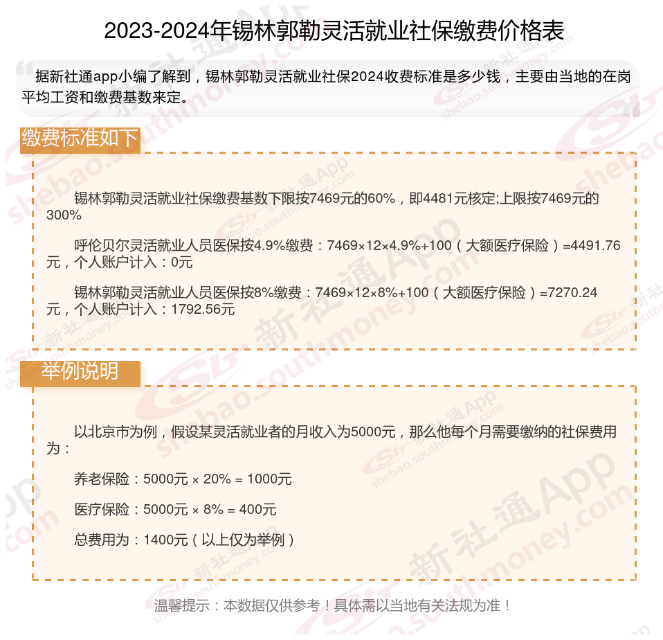 随着经济的发展和社会的进步,灵活就业人员越来越多,但是很多人不知道如何缴纳社保。本文将介绍2025年锡林郭勒灵活就业人员社保缴费基数及如何缴纳社保,能领取多少钱,帮助大家更好地了解灵活就业社保,随着新社通APP小编一起了解锡林郭勒灵活就业社保缴费最新资讯吧。