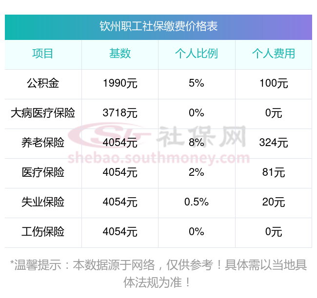 2025年钦州社保缴费多少钱?下表是2023-2024年钦州社保费用明细参考,新社通app-社保缴费查询工具提供的最新数据如下: