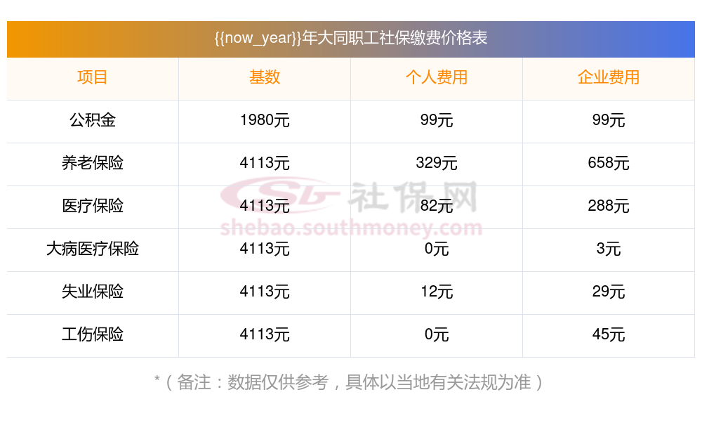 2025年大同社保缴费多少钱?下表是2023-2024年大同社保费用明细参考,新社通app-社保缴费查询工具提供的最新数据如下: