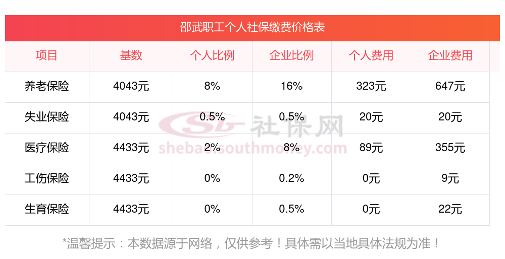 据新社通app显示,邵武社保缴费基数2023-2024年标准,(社保最低一个月要交多少钱)邵武社保费用如下: