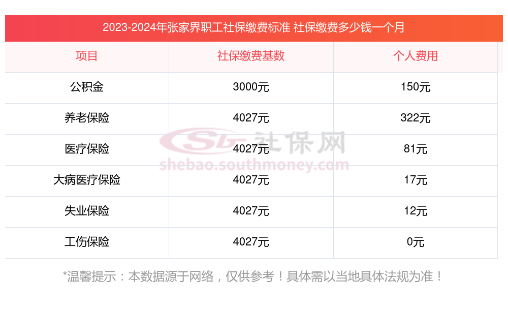 张家界社保多少钱一个月?下面和新社APP一起来看看张家界最低标准社保费用明细参考,新社通app-社保缴费查询工具提供的最新数据如下: