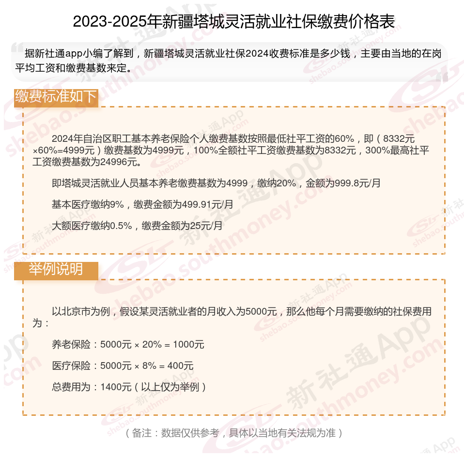 随着经济的发展和社会的进步,灵活就业人员越来越多,但是很多人不知道如何缴纳社保。本文将介绍2025年新疆塔城灵活就业人员社保缴费基数及如何缴纳社保,能领取多少钱,帮助大家更好地了解灵活就业社保,随着新社通APP小编一起了解新疆塔城灵活就业社保缴费最新资讯吧。
