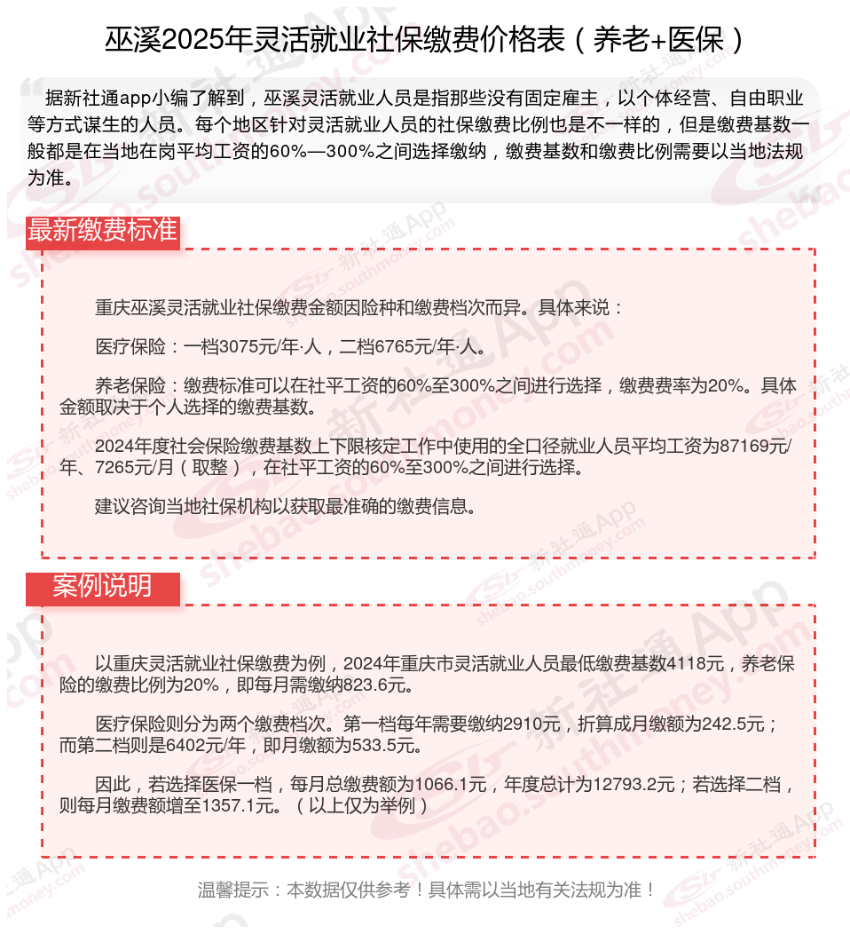 二、2024年巫溪灵活就业社保缴费标准,最新如下: