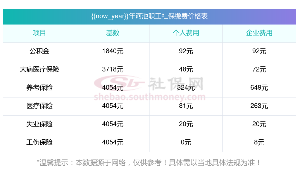 2025年河池社保缴费多少钱?下表是2023-2024年河池社保费用明细参考,新社通app-社保缴费查询工具提供的最新数据如下: